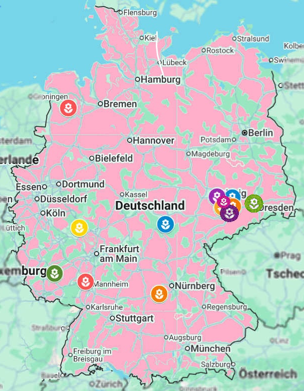 Diese Deutschlandkarte zeigt alle Teilnehmerinnen und Teilnehmer unserer Online-Fotogalerie mit kleinen Markierungen an. Jede Blume steht für einen Wohnort – so lässt sich auf einen Blick erkennen, aus welchen Regionen Beiträge kommen.